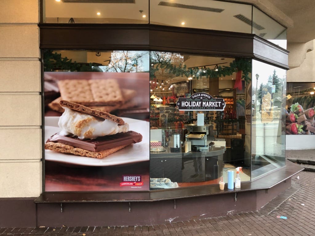This winter AutoTrim & Signs completed a window display project for chocolate brand Hershey’s for the Falls Avenue Holiday Market, an event featuring pop-up stores, live entertainment, seasonal food and drinks, and a walk-through gingerbread house. The window graphics advertised s’mores, the popular cold-weather treat made from marshmallow, chocolate and cookies.