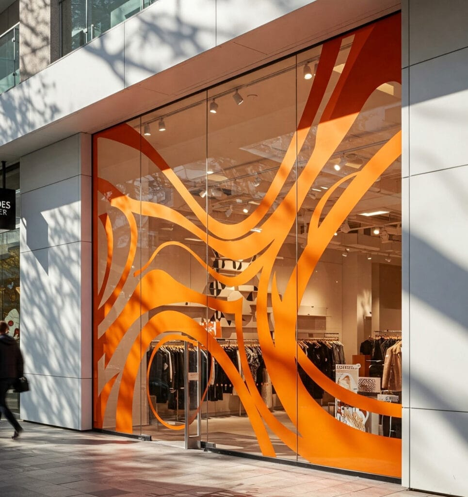 For this second solution, the orange needed to be opaquer than the blue material. As such, Drytac tinted and coated both sides of a white PET film to create an orange, opaque material ready to be used as cut out letters and designs on storefront windows.