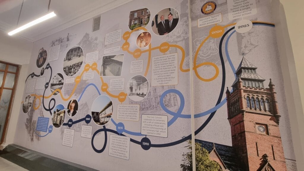 A recent project saw it link up with a local school – Merchant Taylors’ – which is merging its boys’ and girls’ premises onto one site. The school was seeking to improve its interior graphics, with Oriel Studios given the task of producing a centrepiece installation celebrating the history of both schools.
