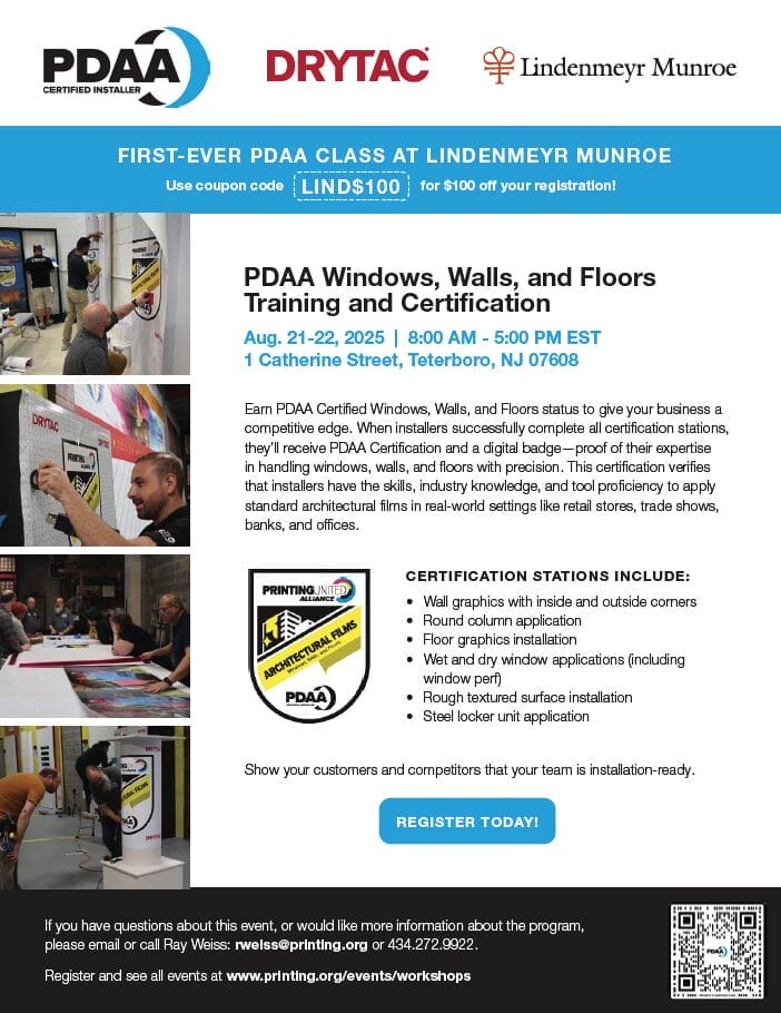 Drytac is proud to support the upcoming PDAA Windows, Walls, and Floors Certification event, taking place August 21–22, 2025, at Lindenmeyr Munroe in Teterboro, NJ. As a key sponsor, Drytac is providing the high-performance films used throughout the hands-on training and testing stations.