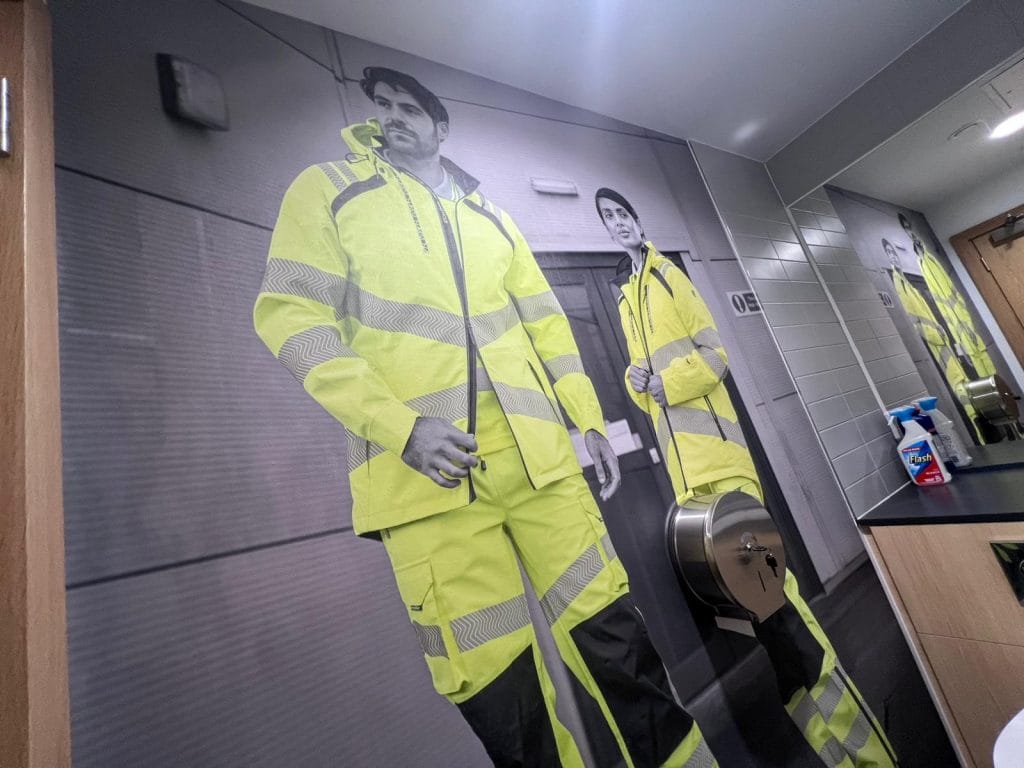 On a recent project, Signs Express Gloucester was tasked with creating a set of eye-catching graphics for use inside a customer’s office building. The design was a mixture of black and white and colourful images, with the stand-out elements being the fluorescent green and orange of workers’ high-vis safety jackets and uniforms.