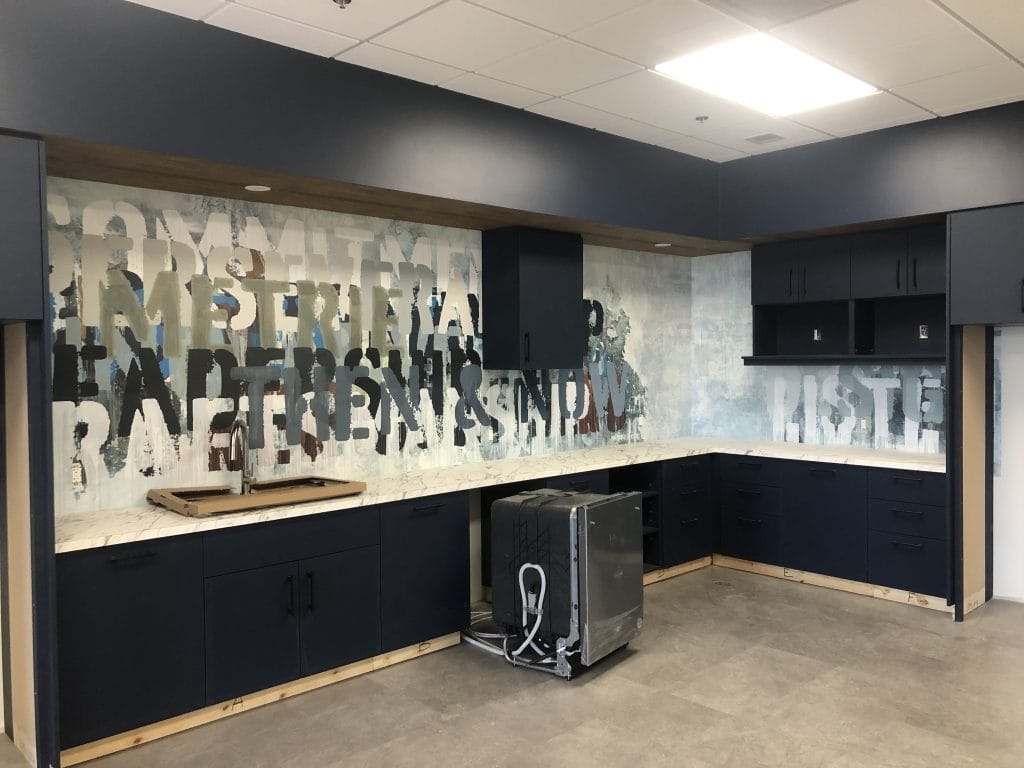 Drytac Protac AMP was applied to surfaces in the kitchen area of WII Projects Calgary warehouse to help prevent the spread of Covid-19 among workers.